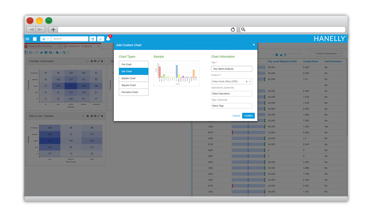 With Hanelly you can use specialized features such as intuitive drag and drop, secure collaboration and scenario specific talent analytics to accelerate post-acquisition integration and mitigate talent risks.